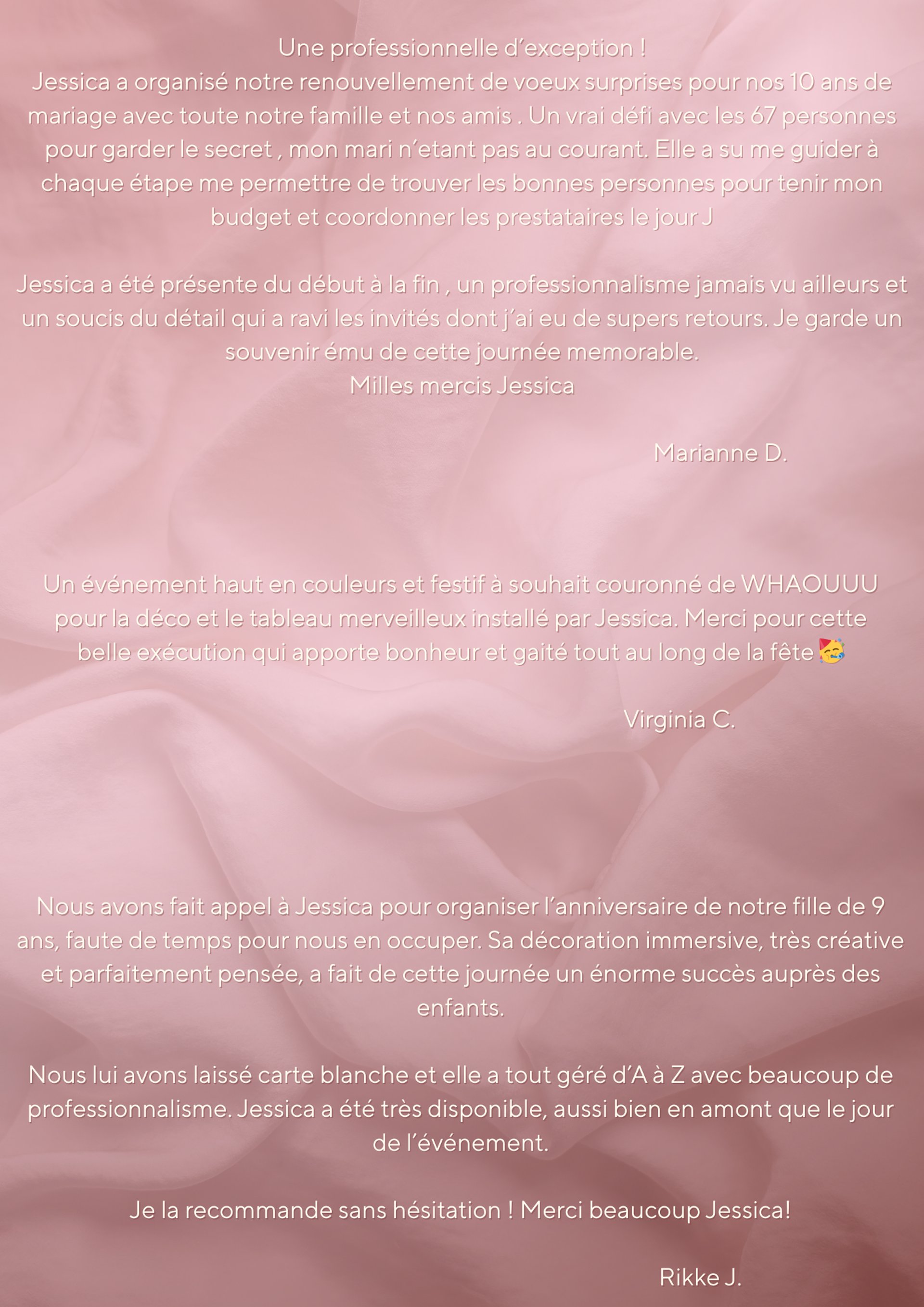 Jessica a été présente du début à la fin , un professionnalisme jamais vu ailleurs et un soucis du détail qui a ravi les invités dont j’ai eu de supers retours. Je garde un souvenir ému de cette journée memorable.